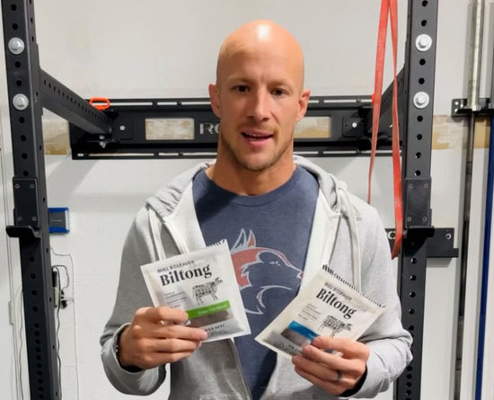 Biltong is a dried beef snack that’s traditionally made in South Africa. Unlike beef jerky, our biltong is made with simple ingredients and without any sugar, artificial preservatives or additives. Beef jerky is made by dehydrating thinly sliced pieces of beef over hours, whereas our biltong is made by air drying a slab of steak over weeks. This leads to a fresher product with superior flavor, texture and nutritional profile.